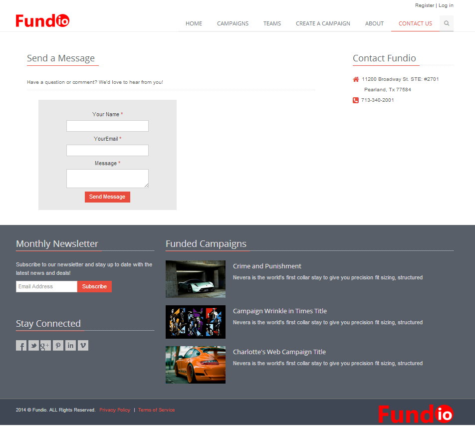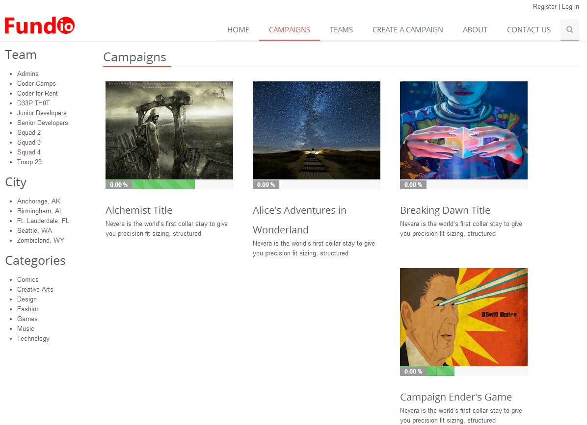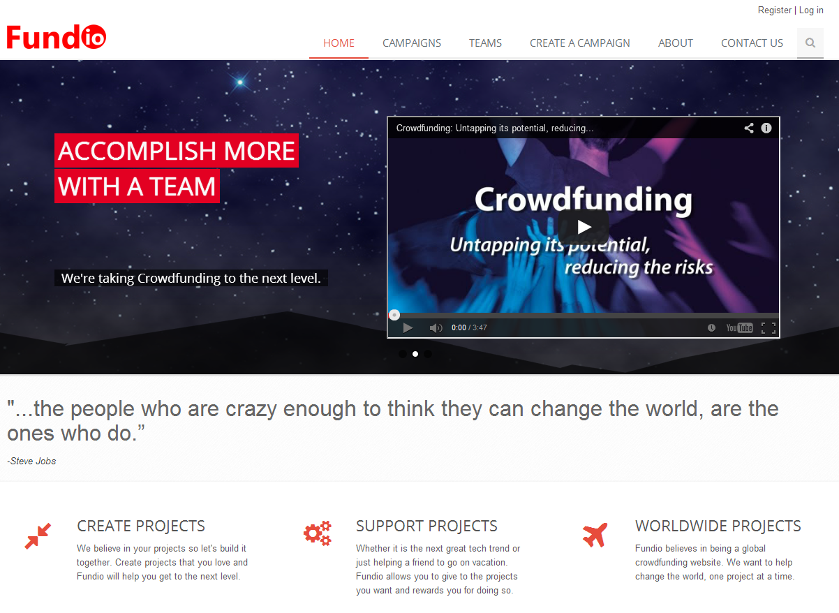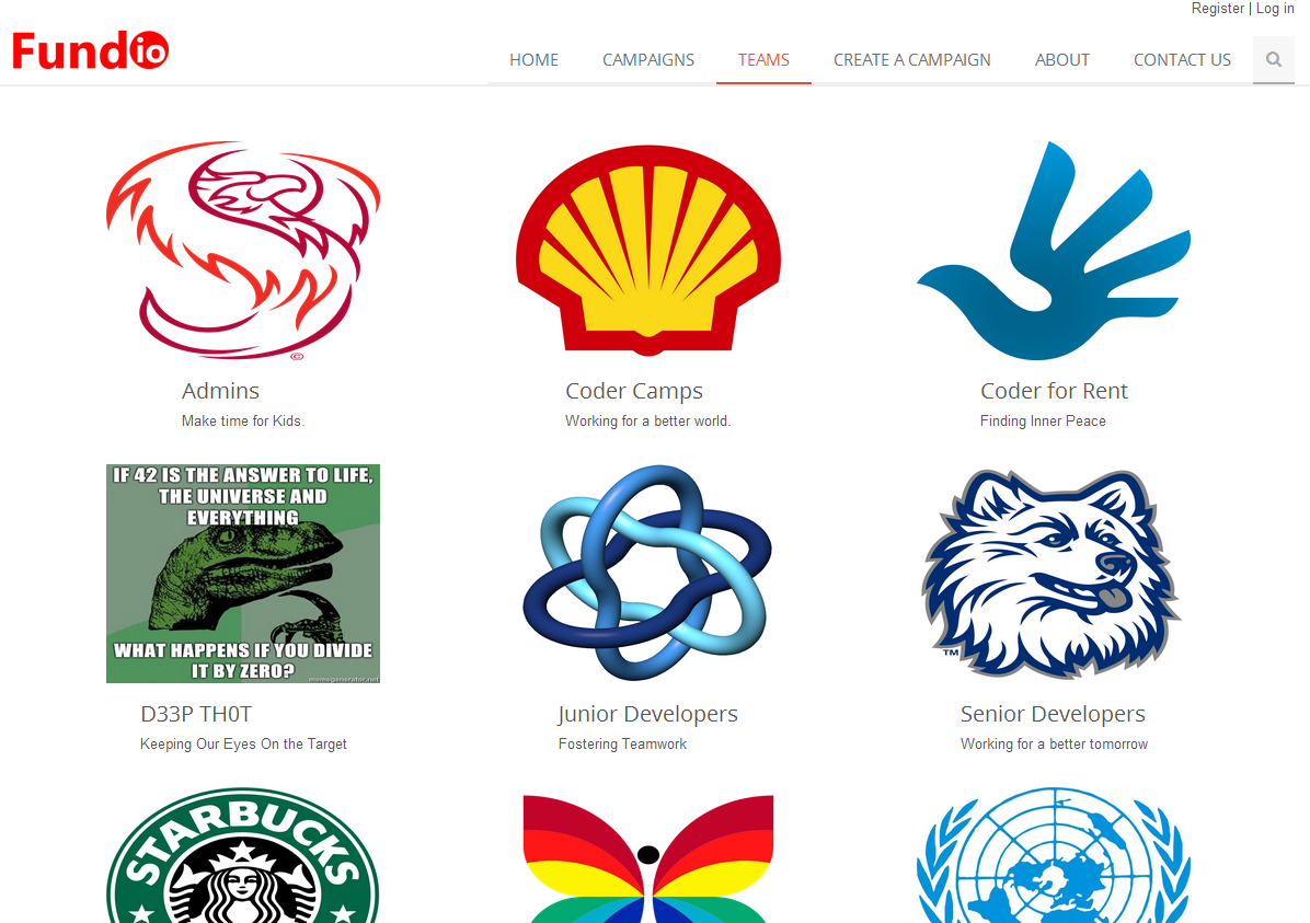 Fund.io is a crowdfunder clone which added a team element where corporations could sponsor groups of crowdfunders on church trips / volunteer work / anything. It was a group project, and I worked on the sign-up process. The site is currently empty and not being used here http://www.fund.io/.